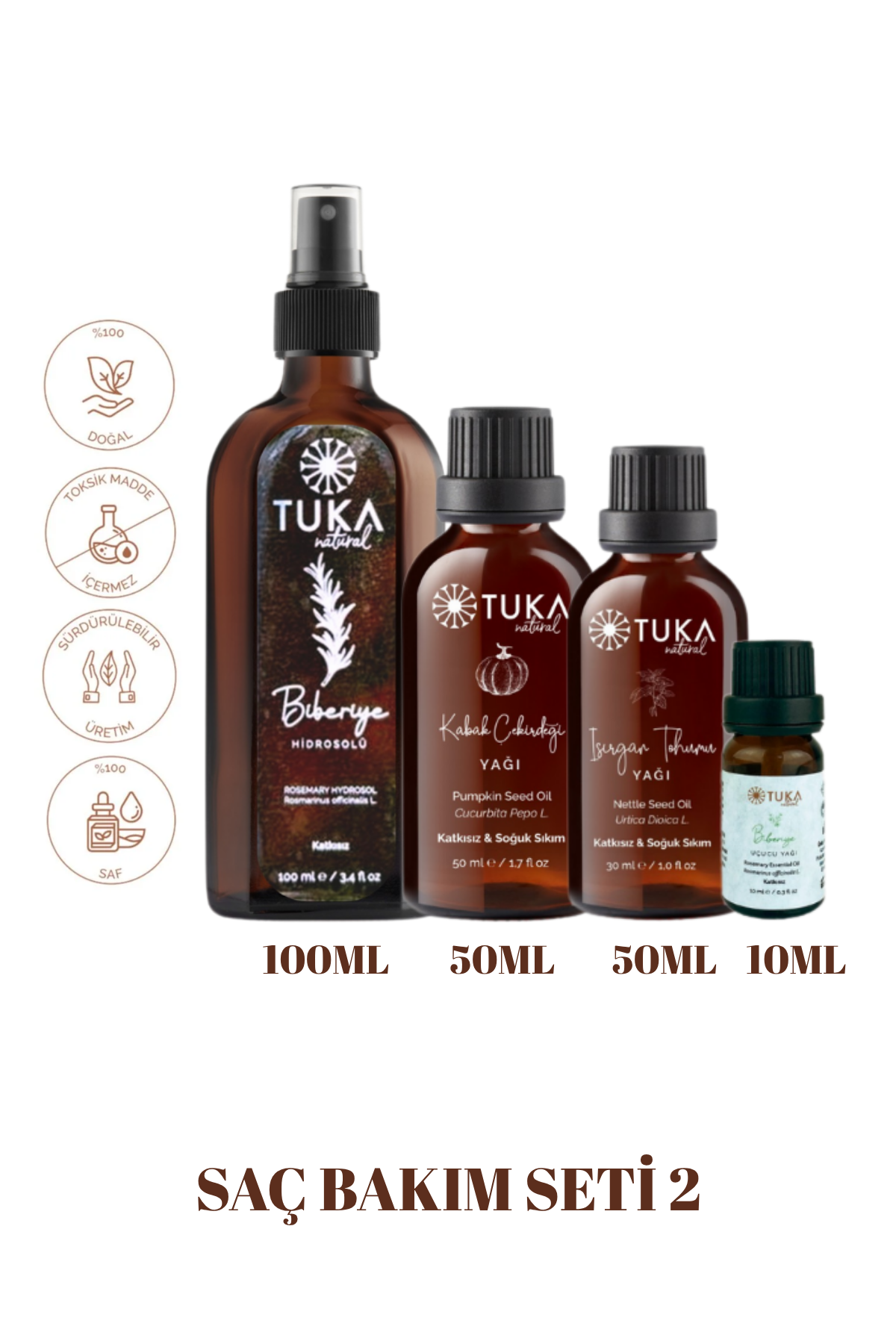 Saç Bakım Seti 2, saç köklerini güçlendirerek dökülmeyi azaltan tamamen bitkisel ve katkısız içeriklerden oluşur. Kabak çekirdeği yağı, ısırgan tohumu yağı, biberiye uçucu yağı ve biberiye hidrosolü birleşerek saç dökülmesine karşı etkili bir bakım rutini oluşturur.